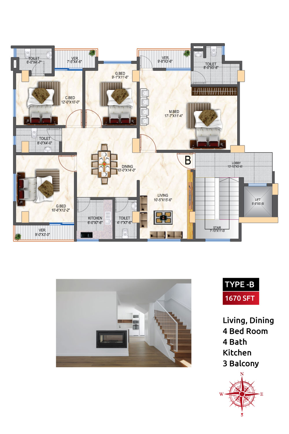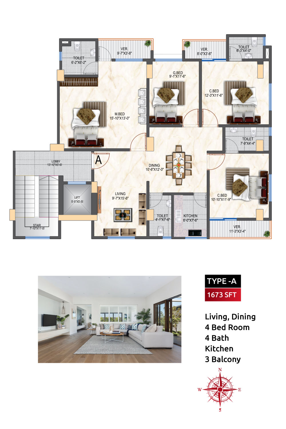 Size of Flat | Type A:1673 sft, Type B: 1670 Sft |