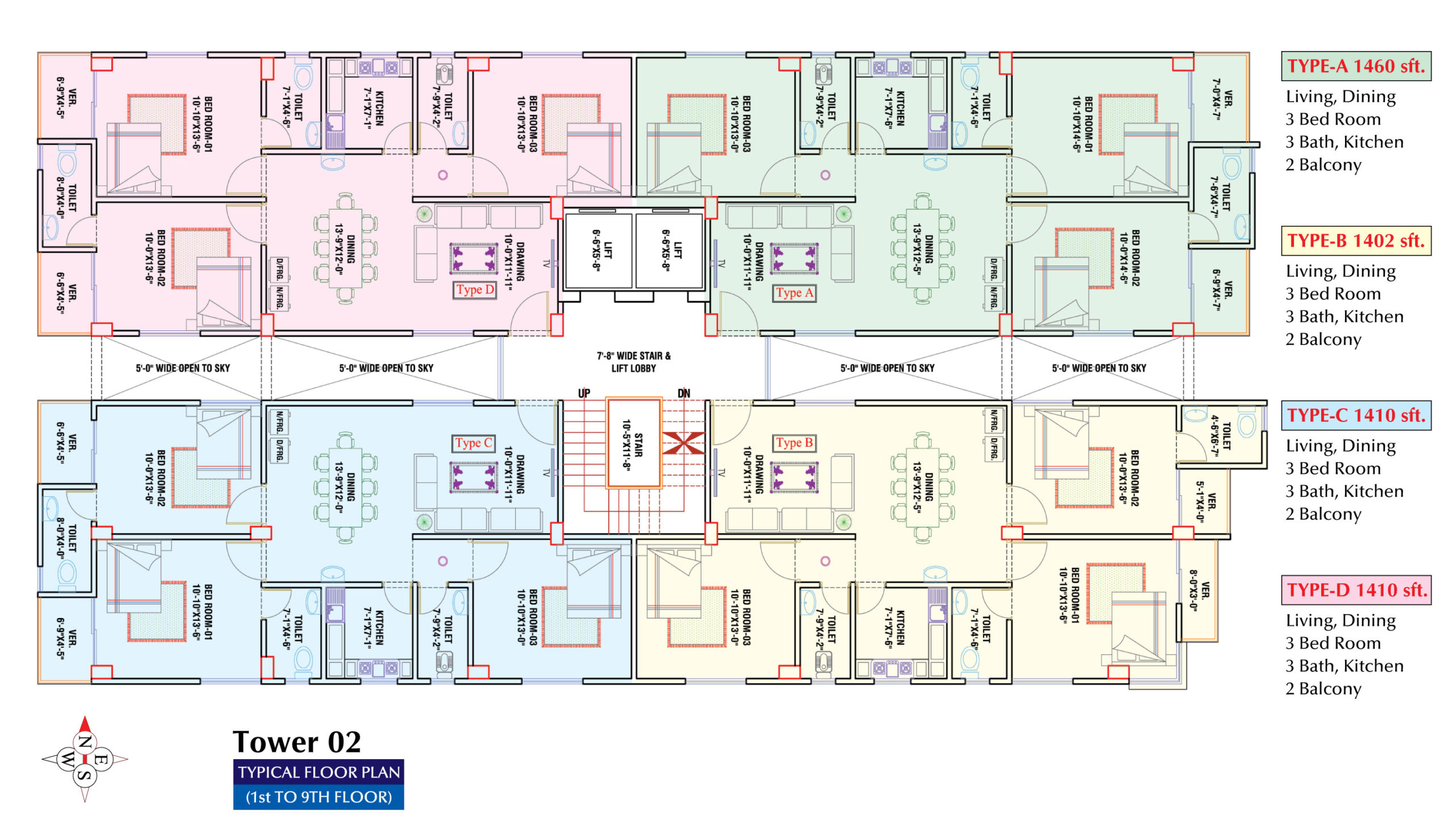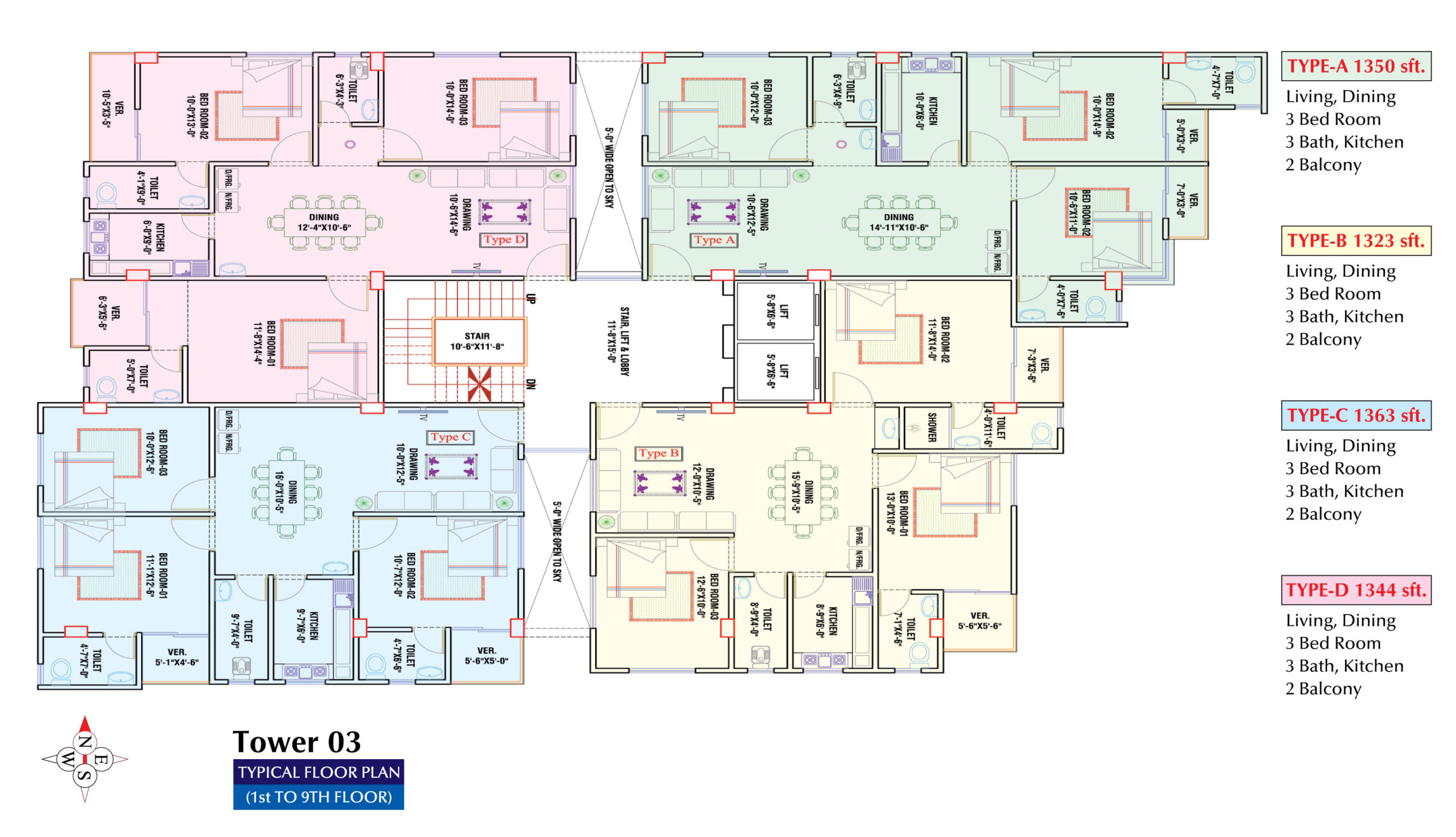 Size of Flat | Tower-1: Type-A: 1437 sft, Type-B: 1350 sft Type-C: 1472 sft, Type-D: 1437 sft. Tower-2: Type-A: 1460 sft, Type-B: 1402 sft Type-C: 1410 sft, Type-D: 1410 sft. Tower-3: Type-A: 1350 sft, Type-B: 1323 sft Type-C: 1363 sft, Type-D: 1344 sft |