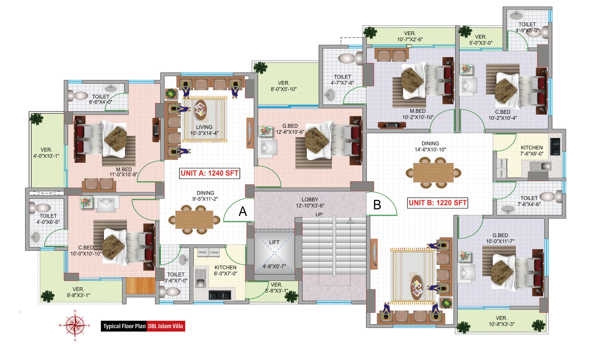 | Size of Flat | Type-A: 1220 sft, Type-B: 1240 sft |